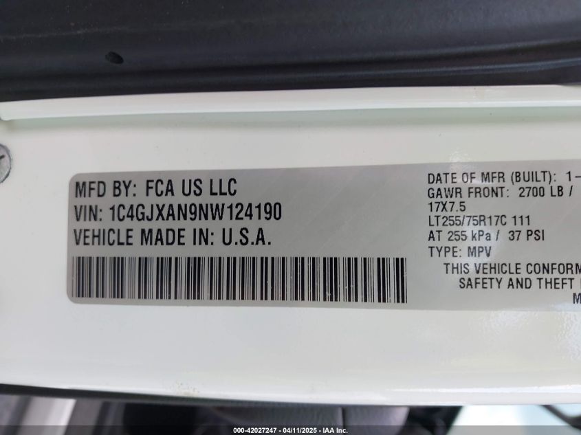 Цвет БелыйЦилиндры 4Привод Полный приводVIN 1C4GJXAN9NW124190Состояние СтационарноПовреждения Задняя праваяДата аукциона 2025-11-18