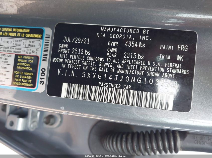 2022 KIA K5 2022 року Бензин, 1.6, Передний привод, vin - 5XXG14J20NG103850 из США