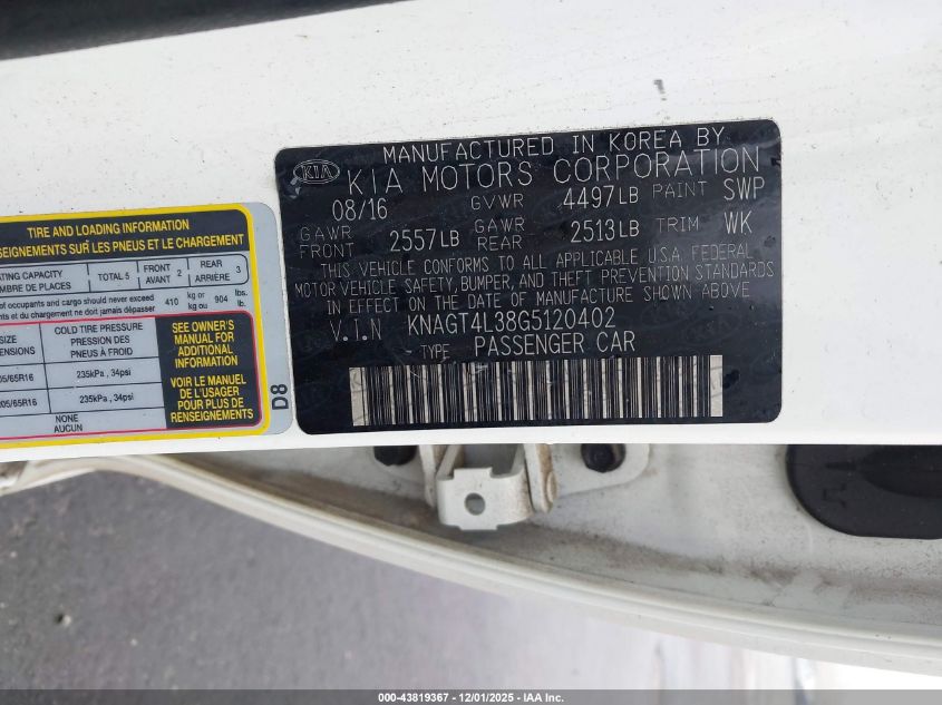 2016 KIA OPTIMA 2016 року Бензин, 2.4, Передний привод, vin - KNAGT4L38G5120402 из США