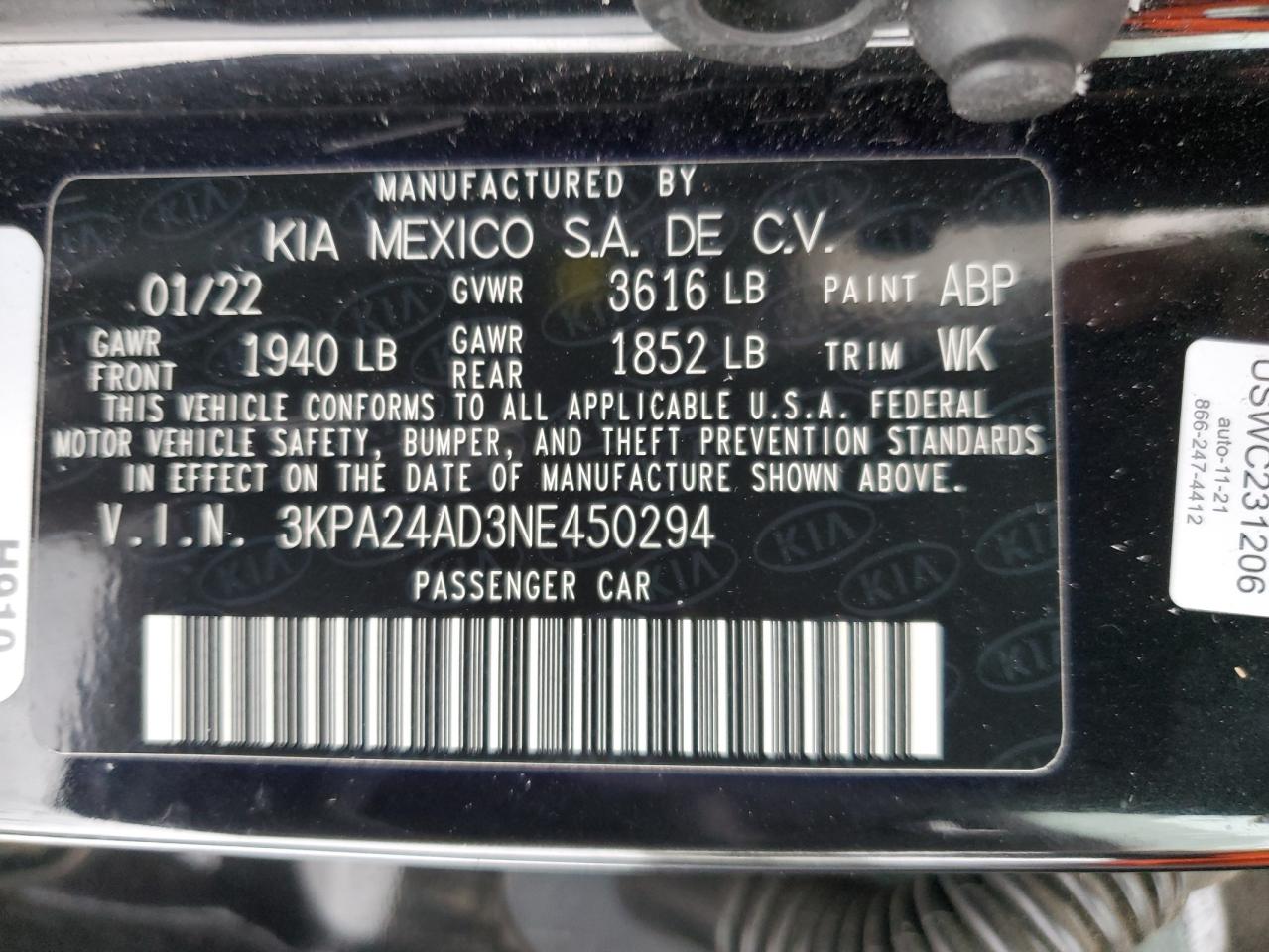 2022 KIA RIO 2022 року Бензин, 1.6, , vin - 3KPA24AD3NE450294 из США