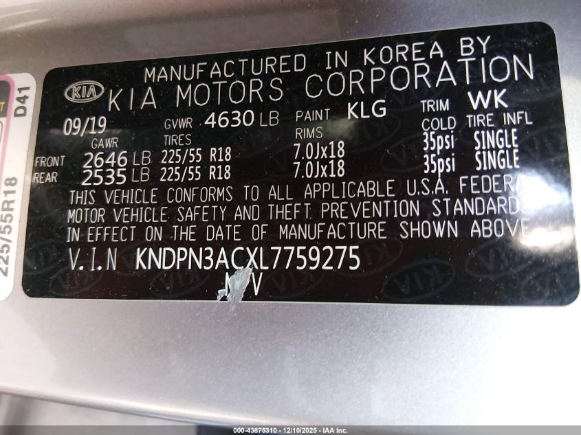 2020 KIA SPORTAGE 2020 року Бензин, 2.4, Передний привод, vin - KNDPN3ACXL7759275 из США