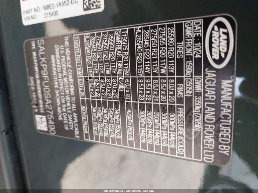 Цвет ЗеленыйЦилиндры 6Привод Полный приводVIN SALKP9FU0SA******Состояние НеизвестноПовреждения Передняя и задняяДата аукциона 2025-09-29