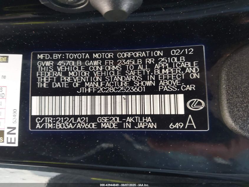 Цвет ЧерныйЦилиндры 6Привод Задний приводVIN JTHFF2C28C2******Состояние НеизвестноПовреждения Передняя или задняяДата аукциона 2025-09-08