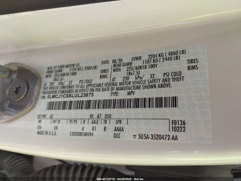 2020 LINCOLN CORSAIR 2020 року Бензин, 2.0, Передний привод, vin - 5LMCJ1C9XLU****** из США