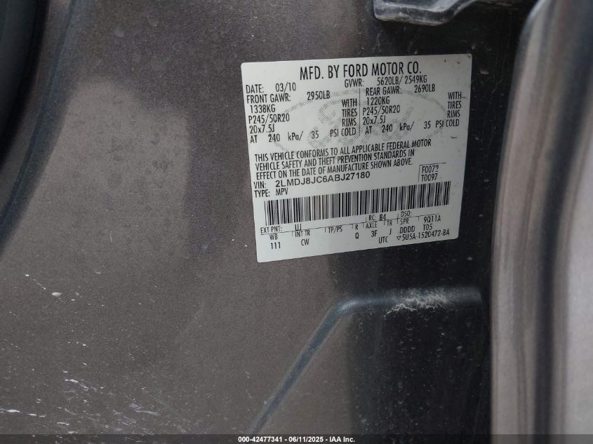 2010 LINCOLN MKX 2010 року Бензин, 3.5, Полный привод, vin - 2LMDJ8JC6AB****** из США