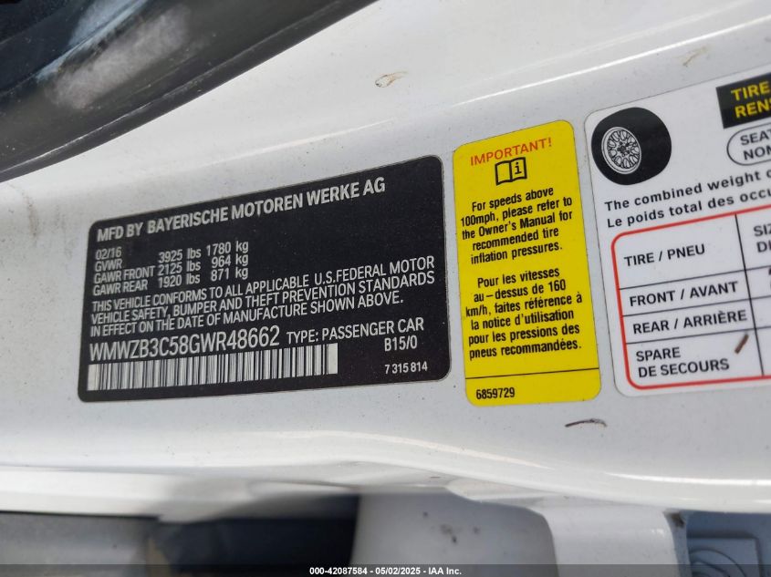 Цвет БелыйЦилиндры 4Привод Передний приводVIN WMWZB3C58GWR48662Состояние СтационарноПовреждения ВодаДата аукциона 2025-10-22