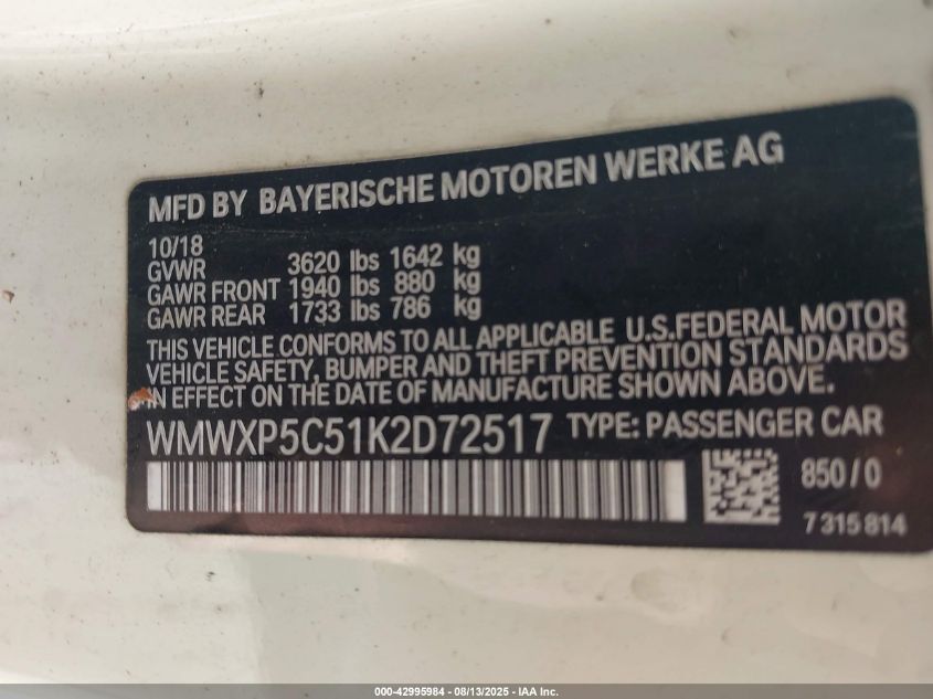 Цвет БелыйЦилиндры 3Привод Передний приводVIN WMWXP5C51K2******Состояние НеизвестноПовреждения Передняя или задняяДата аукциона 2025-08-29