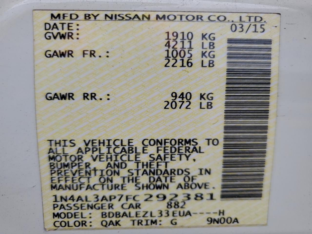 Цвет БелыйЦилиндры 4VIN 1N4AL3AP7FC292381Состояние Заводится и едет (проверено)Повреждения Задняя AutoRIA