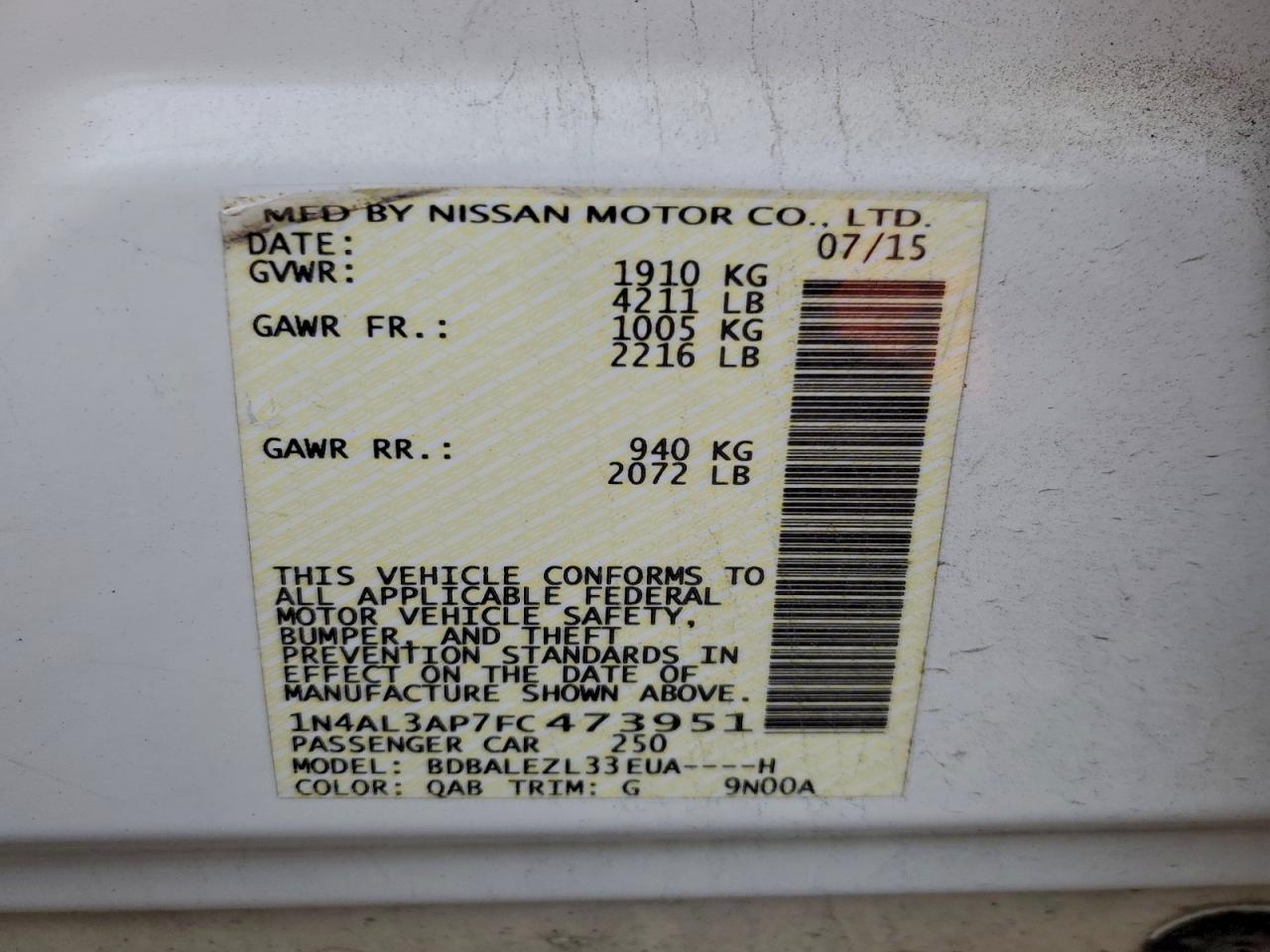Цвет БелыйЦилиндры 4VIN 1N4AL3AP7FC473951Состояние Заводится и едет (проверено)Повреждения Передняя или задняя AutoRIA