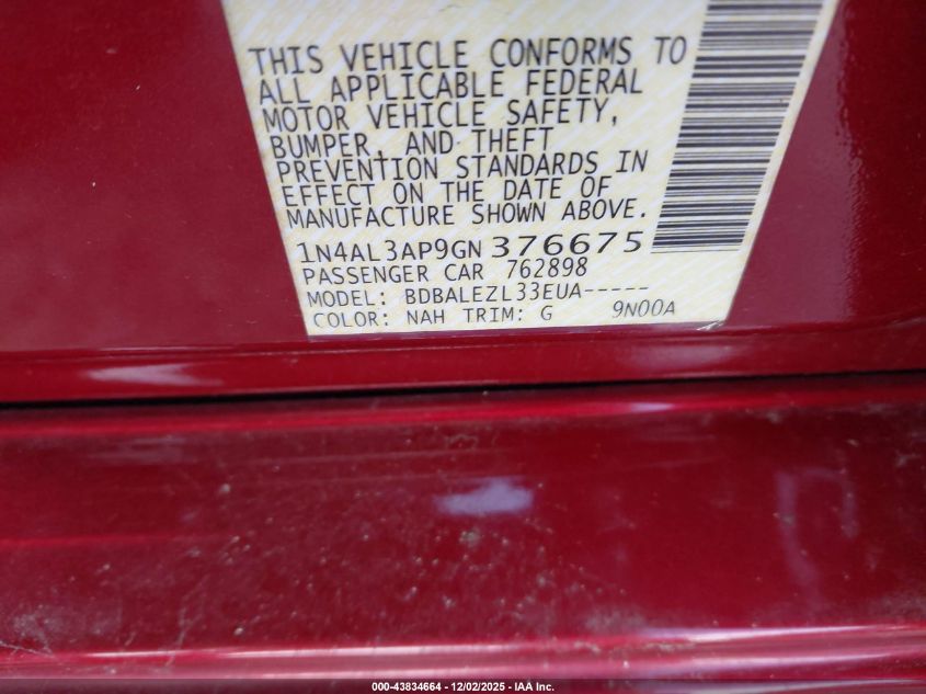 Цвет КрасныйЦилиндры 4Привод Передний приводVIN 1N4AL3AP9GN376675Состояние Заводится и едет (проверено)Повреждения Задняя AutoRIA