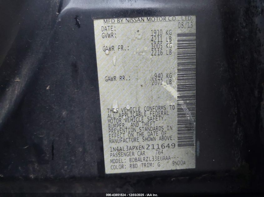 2014 NISSAN ALTIMA 2014 року Бензин, 2.5, Передний привод, vin - 1N4AL3APXEN211649 из США