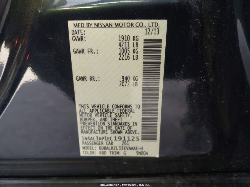 2014 NISSAN ALTIMA 2014 року Бензин, 2.5, Передний привод, vin - 1N4AL3AP1EC191125 из США