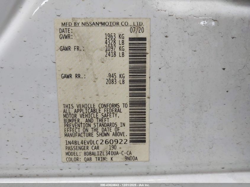 2020 NISSAN ALTIMA 2020 року Бензин, 2.5, Передний привод, vin - 1N4BL4EV0LC260922 из США