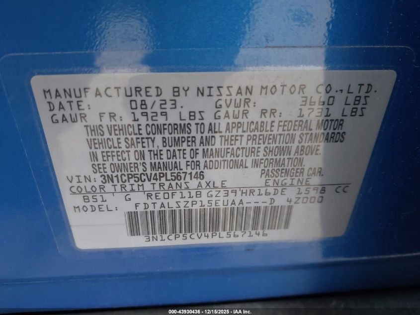 2023 NISSAN KICKS 2023 року Бензин, 1.6, Передний привод, vin - 3N1CP5CV4PL567146 из США