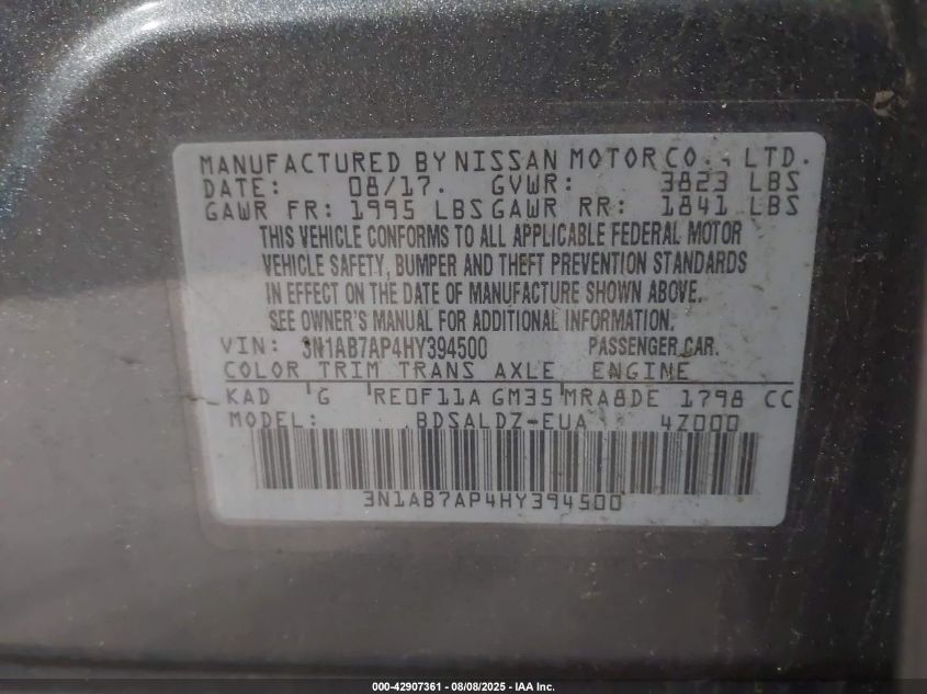 Цвет СерыйЦилиндры 4Привод Передний приводVIN 3N1AB7AP4HY******Состояние НеизвестноПовреждения Передняя праваяДата аукциона 2025-09-17