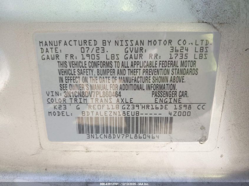 2023 NISSAN VERSA 2023 року Бензин, 1.6, Передний привод, vin - 3N1CN8DV7PL860464 из США