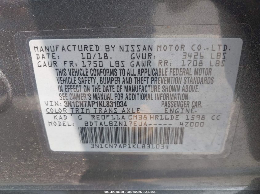 2019 NISSAN VERSA 2019 року Бензин, 1.6, Передний привод, vin - 3N1CN7AP1KL831034 из США