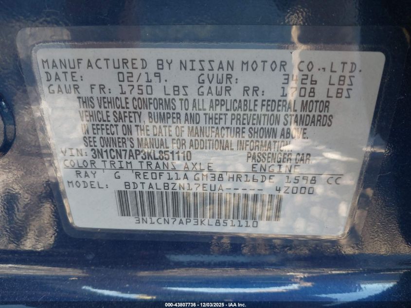 2019 NISSAN VERSA S