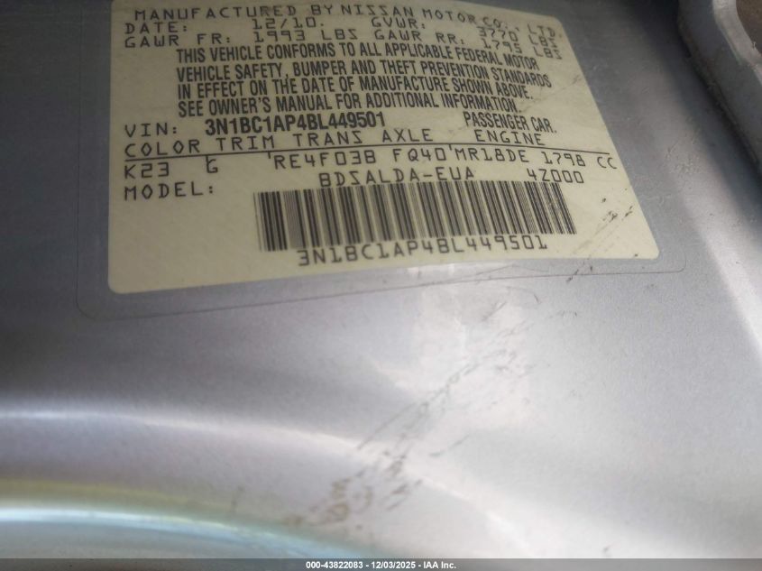 2011 NISSAN VERSA 2011 року Бензин, 1.8, Передний привод, vin - 3N1BC1AP4BL449501 из США
