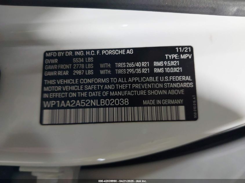 2022 PORSCHE MACAN 2022 року Бензин, 2.0, Полный привод, vin - WP1AA2A52NL****** из США