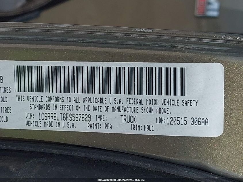 Цвет ЗеленыйЦилиндры 8Привод НеизвестноVIN 1C6RR6LT6FS******Состояние НеизвестноПовреждения Передняя или задняяДата аукциона 2025-08-18