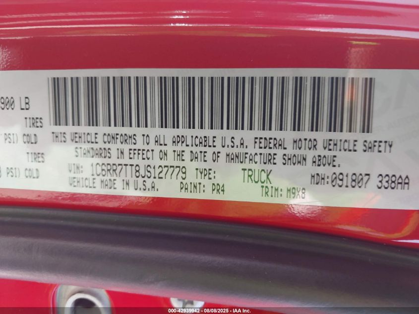 Цвет КрасныйЦилиндры 8Привод Полный приводVIN 1C6RR7TT8JS******Состояние НеизвестноПовреждения Задняя леваяДата аукциона 2025-10-01