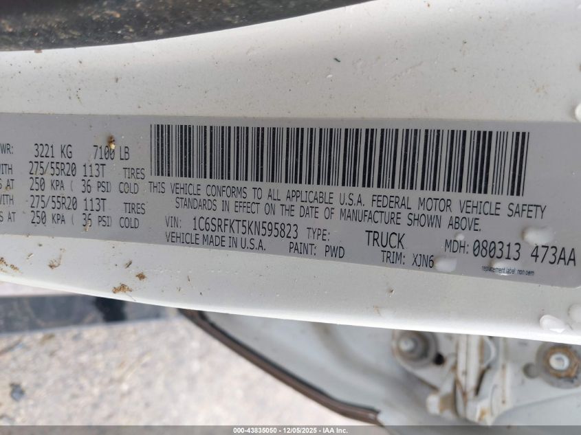 Цвет БелыйЦилиндры 8Привод Полный приводVIN 1C6SRFKT5KN595823Состояние Заводится и едет (проверено)Повреждения Левая сторона AutoRIA