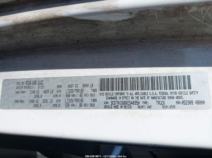 Цвет БелыйЦилиндры 6Привод Передний приводVIN 3C6TRVDG6KE540350Состояние СтационарноПовреждения Передняя или задняя