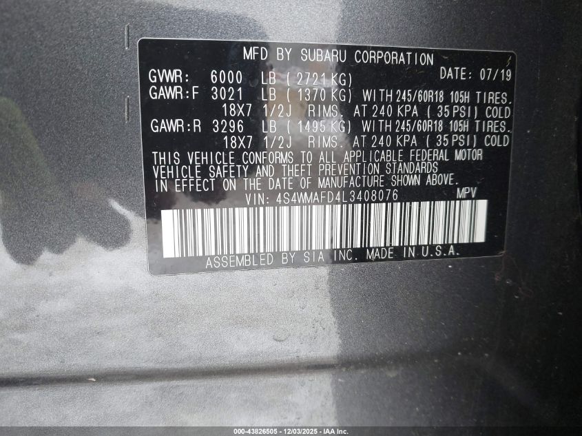 2020 SUBARU ASCENT 2020 року Бензин, 2.4, Полный привод, vin - 4S4WMAFD4L3408076 из США