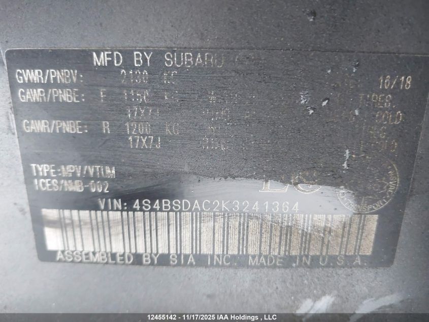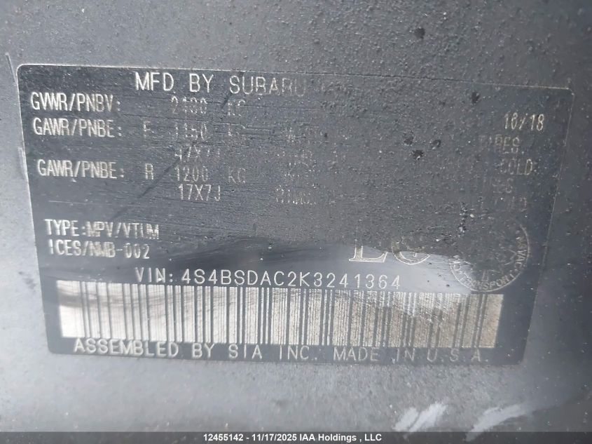 2019 SUBARU LEGACY 2019 року Бензин, , Полный привод, vin - 4S4BSDAC2K3241364 из США