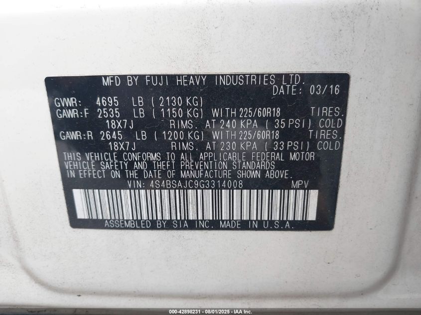 2016 SUBARU OUTBACK 2.5I PREMIUM