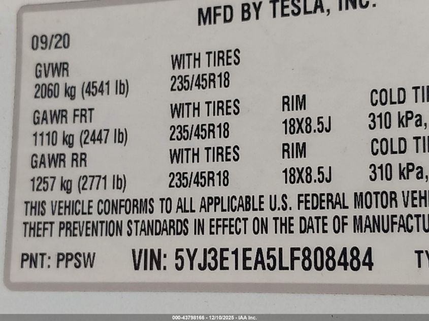 2020 TESLA MODEL 3