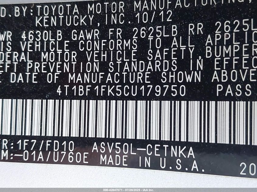 2012 TOYOTA CAMRY 2012 року Бензин, 2.5, Передний привод, vin - 4T1BF1FK5CU****** из США