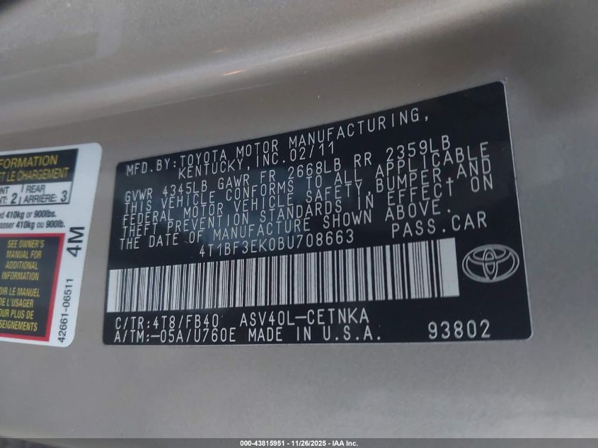 2011 TOYOTA CAMRY BASE