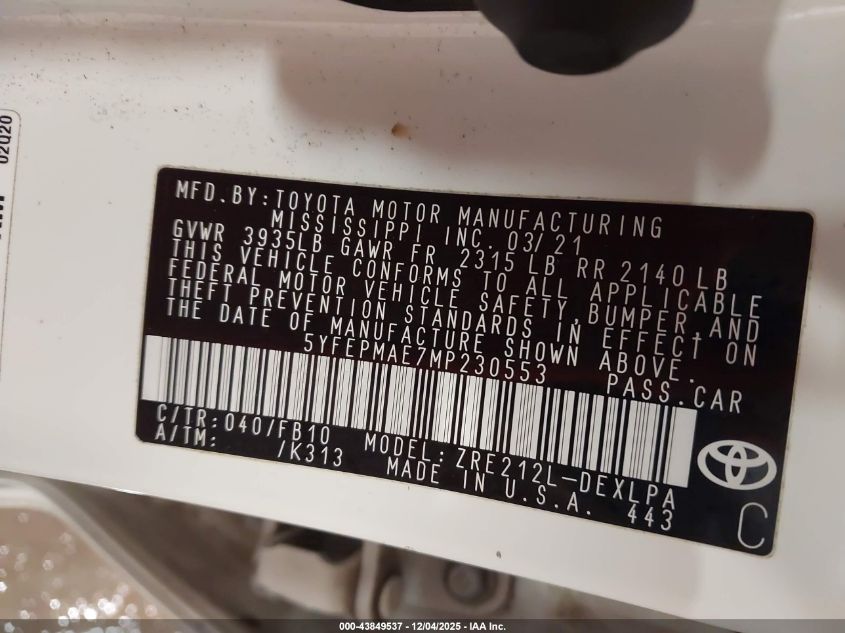2021 TOYOTA COROLLA LE