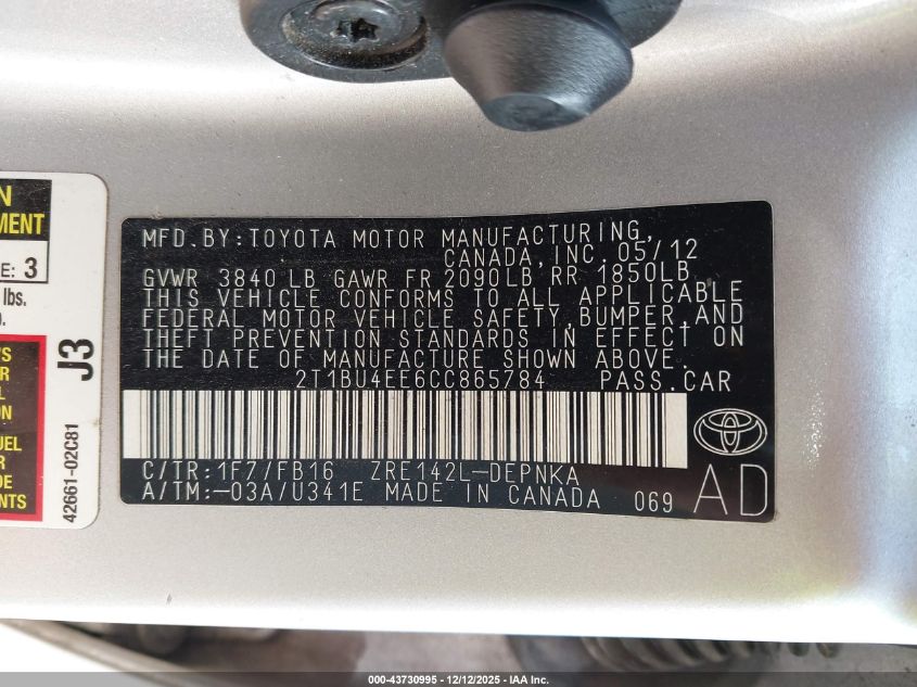 2012 TOYOTA COROLLA BASE