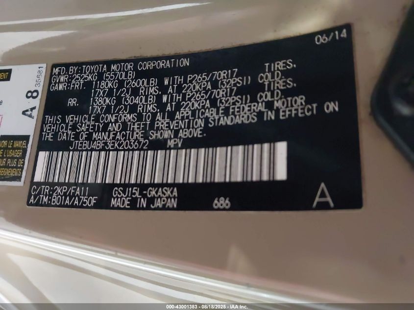 Цвет ЗагарЦилиндры 6Привод Полный приводVIN JTEBU4BF3EK******Состояние НеизвестноПовреждения Передняя или задняяДата аукциона 2025-08-27