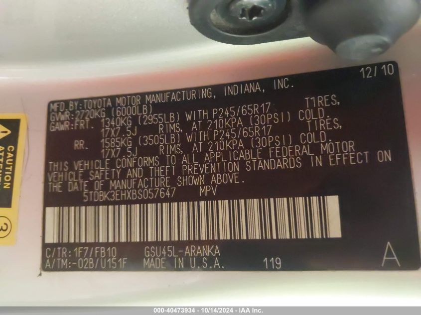 2011 TOYOTA HIGHLANDER 2011 року Бензин, 3.5, Полный привод, vin - 5TDBK3EHXBS057647 из США