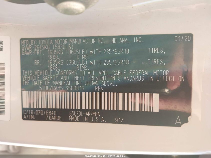 2020 TOYOTA HIGHLANDER LIMITED