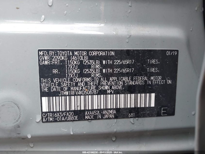 Цвет СерыйЦилиндры 4Привод Передний приводVIN JTMW1RFV4KD******Состояние НеизвестноПовреждения Передняя или задняяДата аукциона 2025-06-24