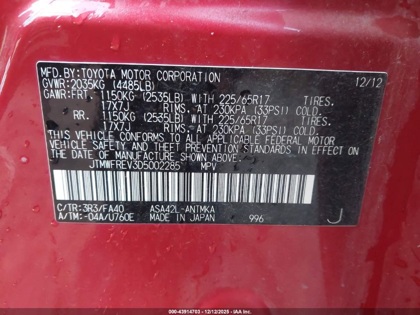 Цвет КрасныйЦилиндры 4Привод Передний приводVIN JTMWFREV3D5002285Состояние Заводится и едет (проверено)Повреждения Задняя AutoRIA