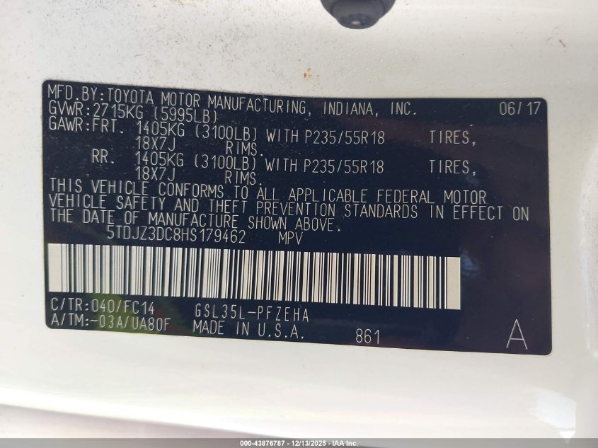 2017 TOYOTA SIENNA 2017 року Бензин, 3.5, Полный привод, vin - 5TDJZ3DC8HS179462 из США