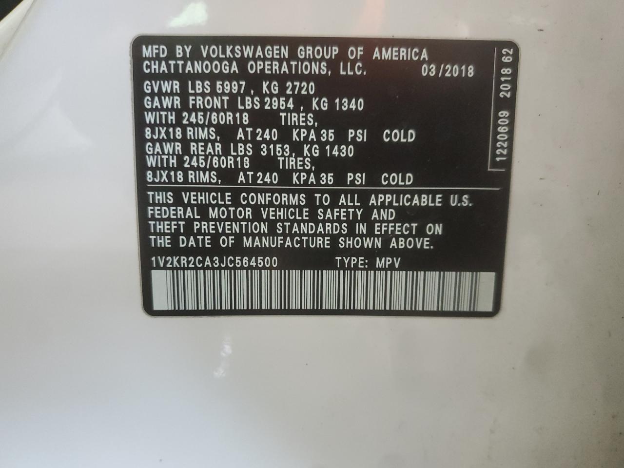 2018 VOLKSWAGEN ATLAS 2018 року Бензин, 3.6, Полный привод, vin - 1V2KR2CA3JC564500 из США