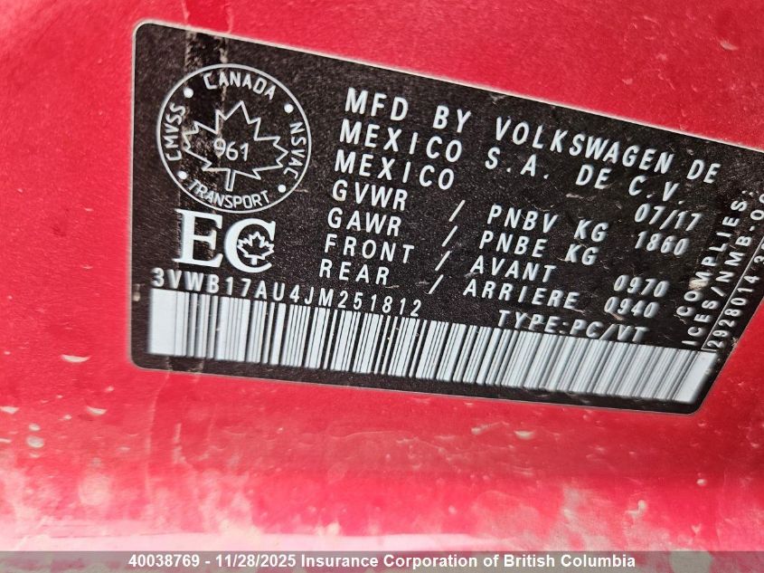 Цвет КрасныйЦилиндры 4Привод Передний приводVIN 3VWB17AU4JM251812Состояние СтационарноПовреждения ПередняяДата аукциона 2025-12-05 AutoRIA