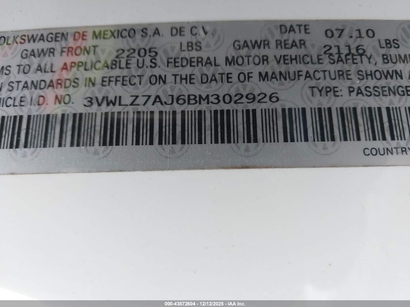2011 VOLKSWAGEN JETTA 2011 року Бензин, 2.5, Передний привод, vin - 3VWLZ7AJ6BM302926 из США