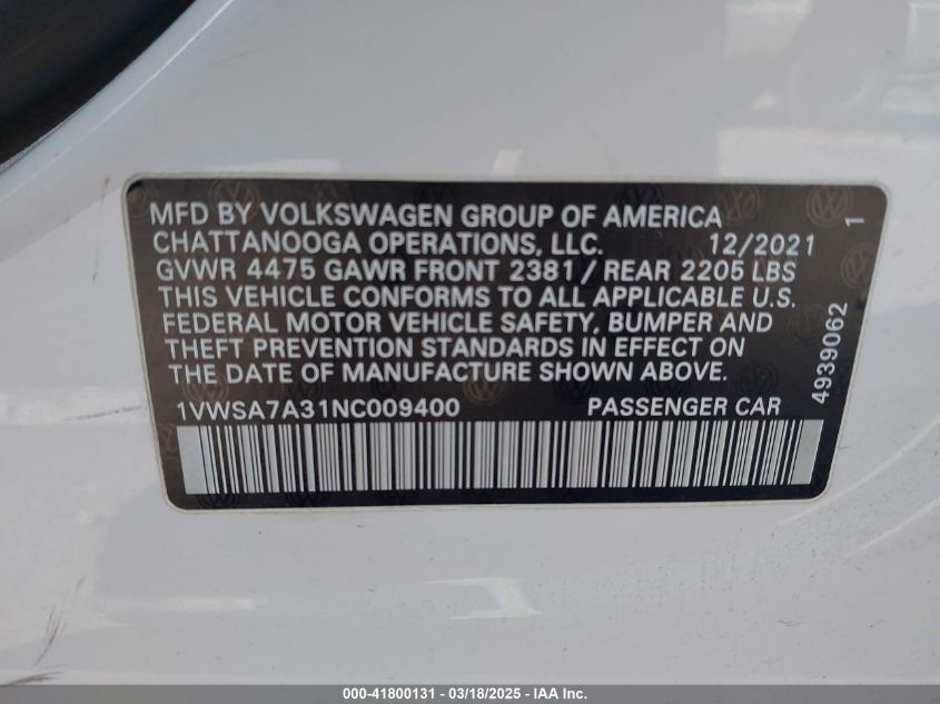 2022 VOLKSWAGEN PASSAT 2022 року Бензин, 2.0, Передний привод, vin - 1VWSA7A31NC****** из США