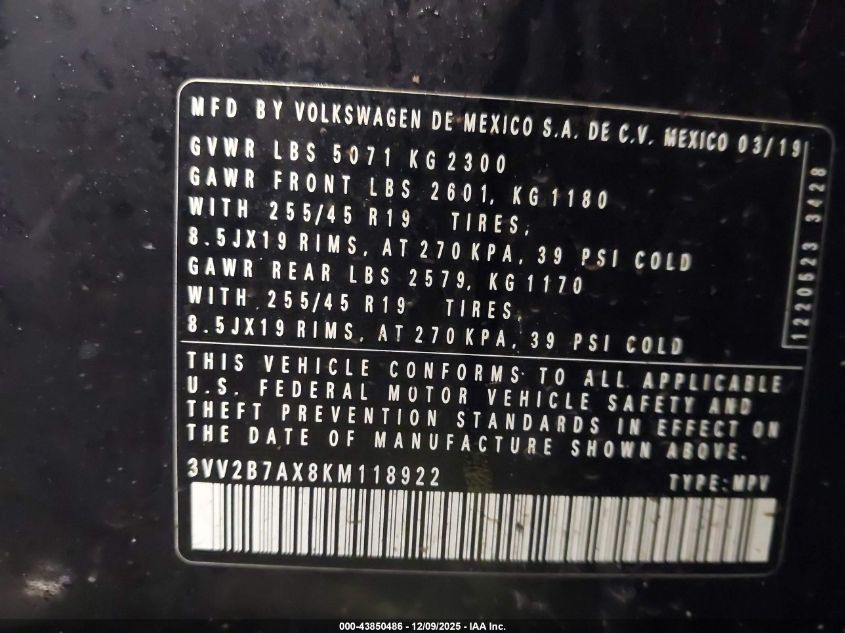 2019 VOLKSWAGEN TIGUAN 2019 року Бензин, 2.0, Полный привод, vin - 3VV2B7AX8KM118922 из США