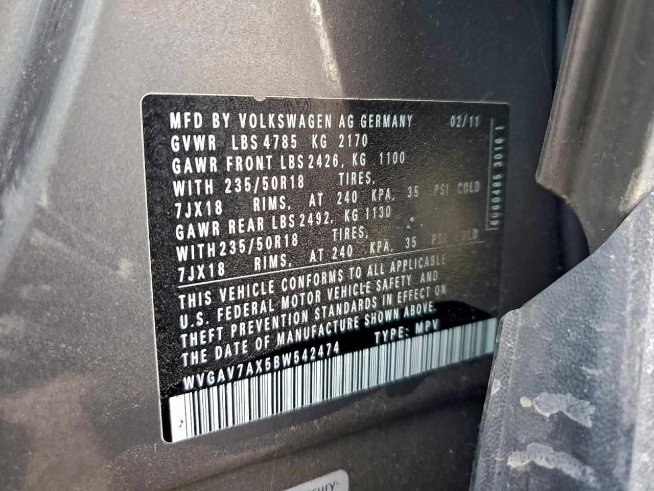 2011 VOLKSWAGEN TIGUAN 2011 року Бензин, 2.0, , vin - WVGAV7AX5BW542474 из США