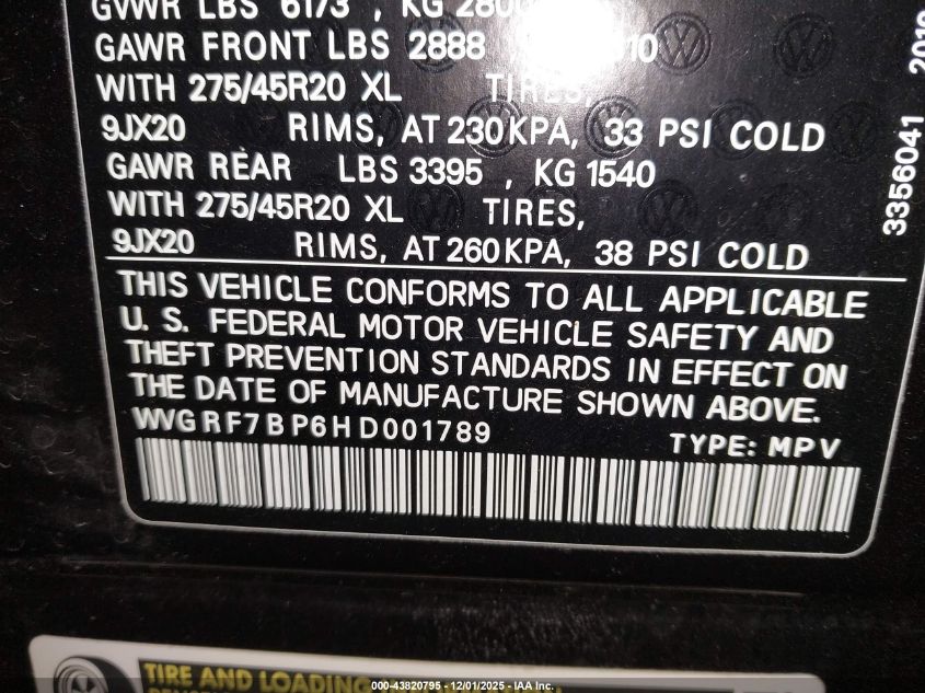 2017 VOLKSWAGEN TOUAREG 2017 року Бензин, 3.6, Полный привод, vin - WVGRF7BP6HD001789 из США