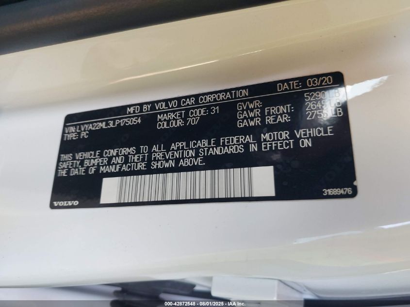 2020 VOLVO S90 2020 року Бензин, 2.0, Полный привод, vin - LVYA22ML3LP175054 из США